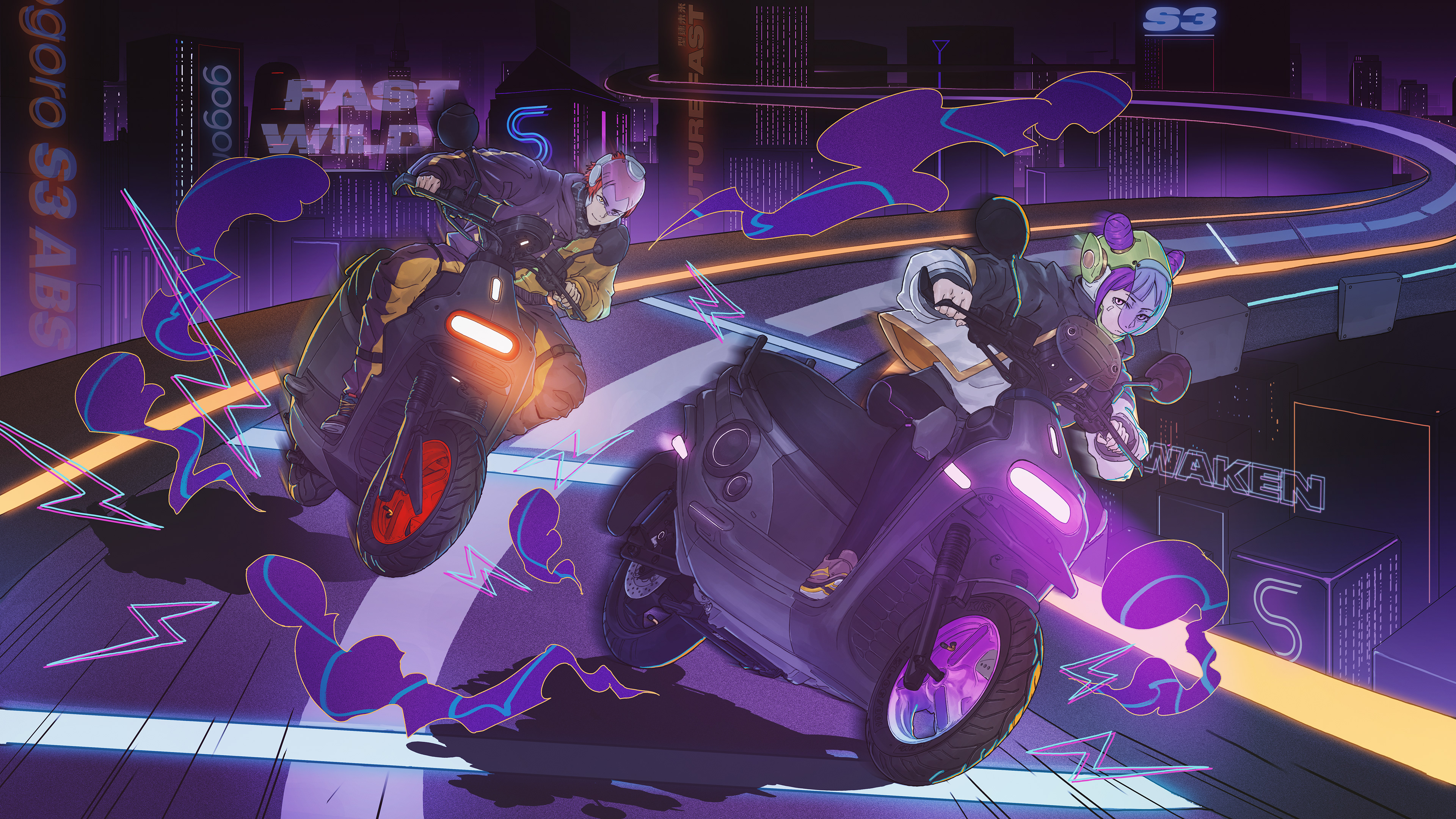因此我們期望呈現出廢棄美與光感科技調的賽博龐克風格,與帥氣的男女主角共同競速未來